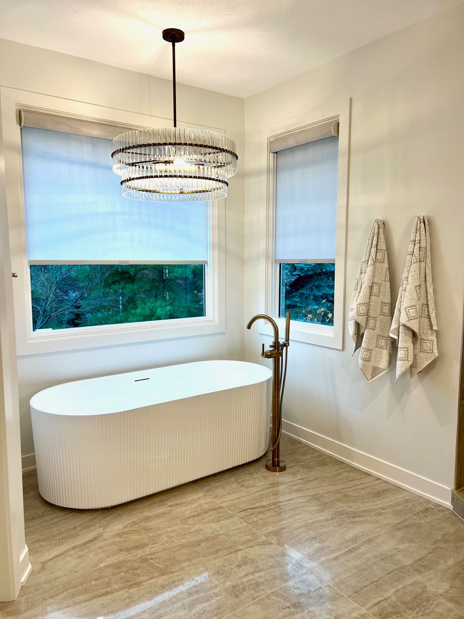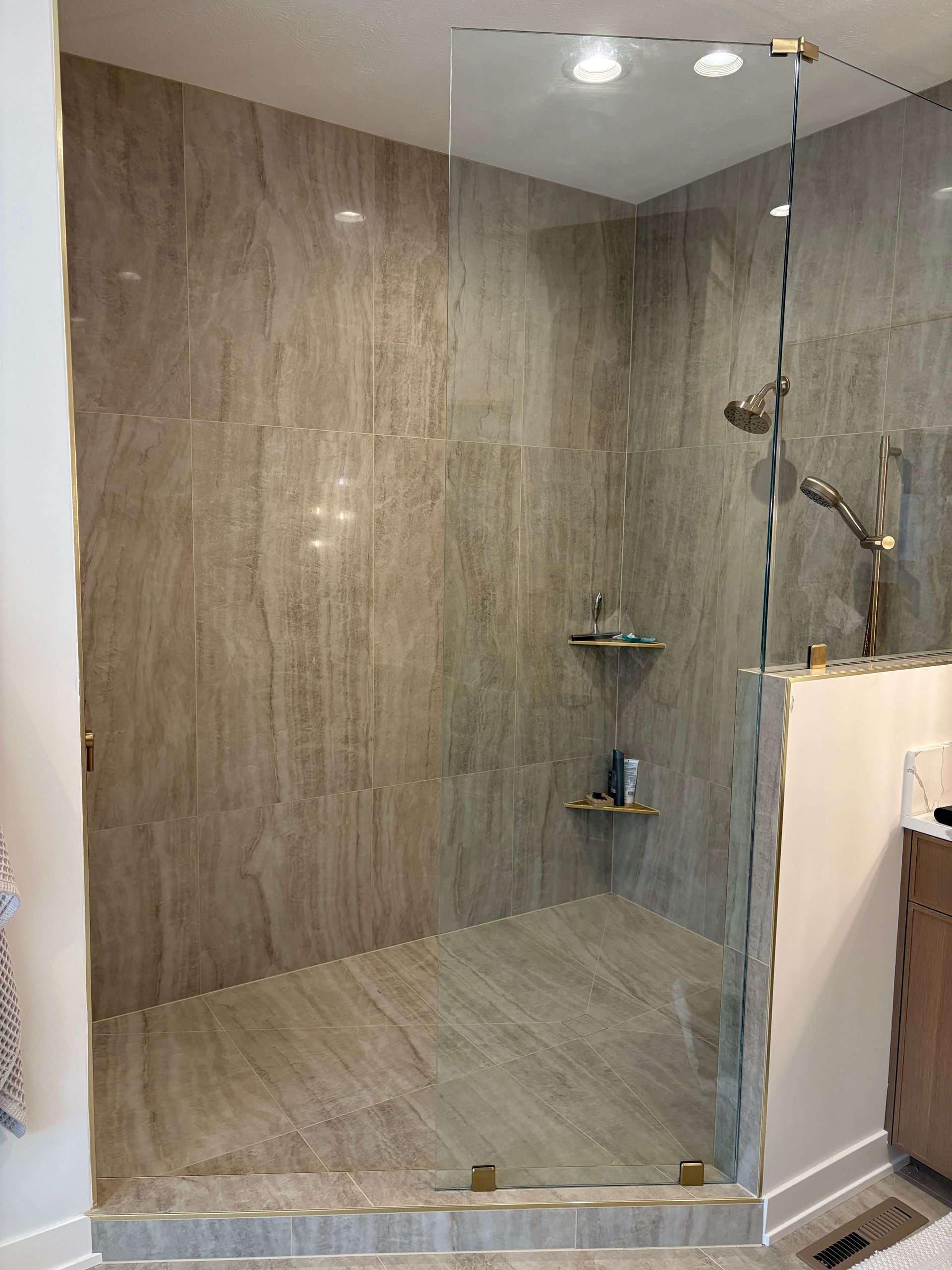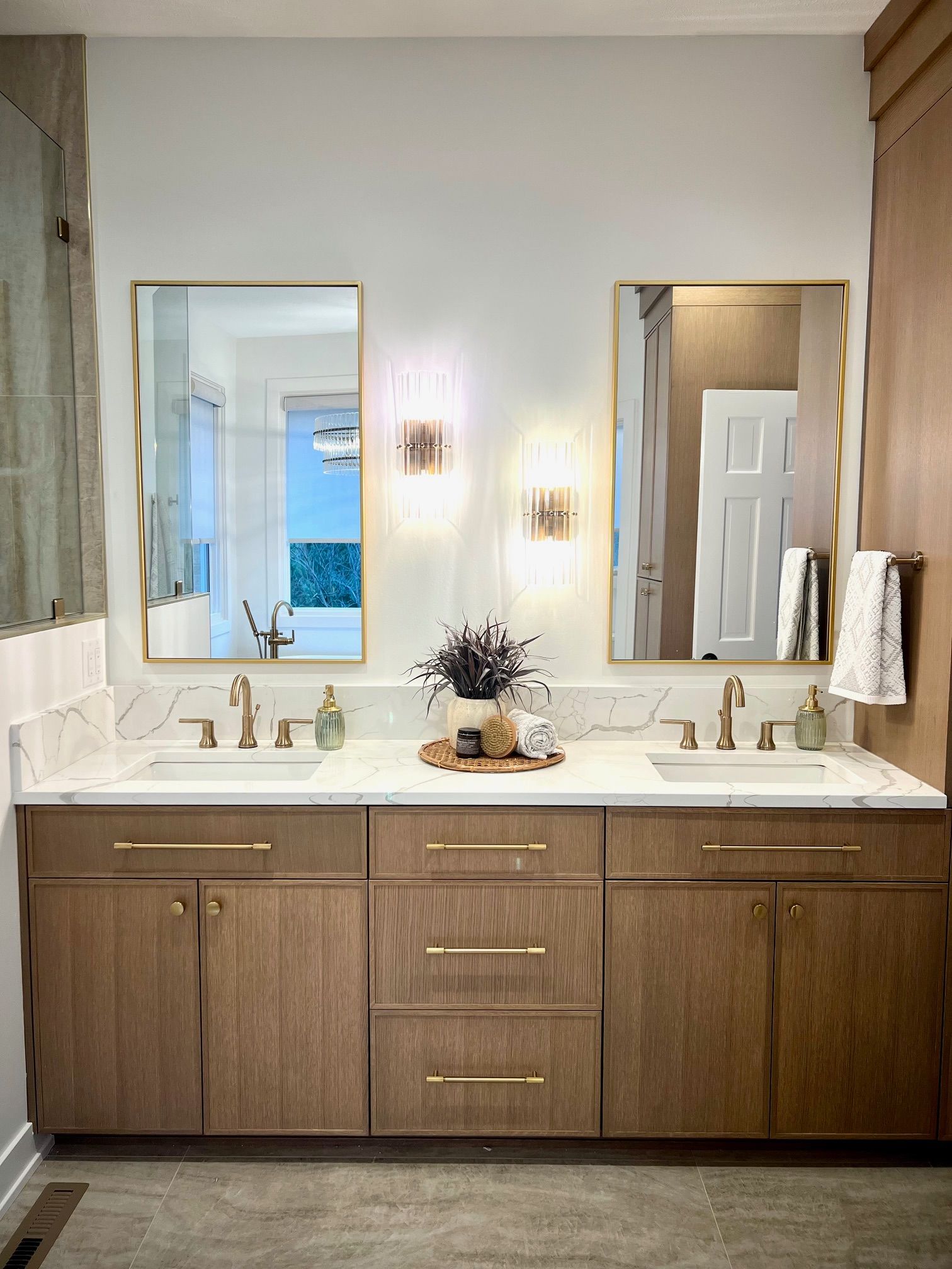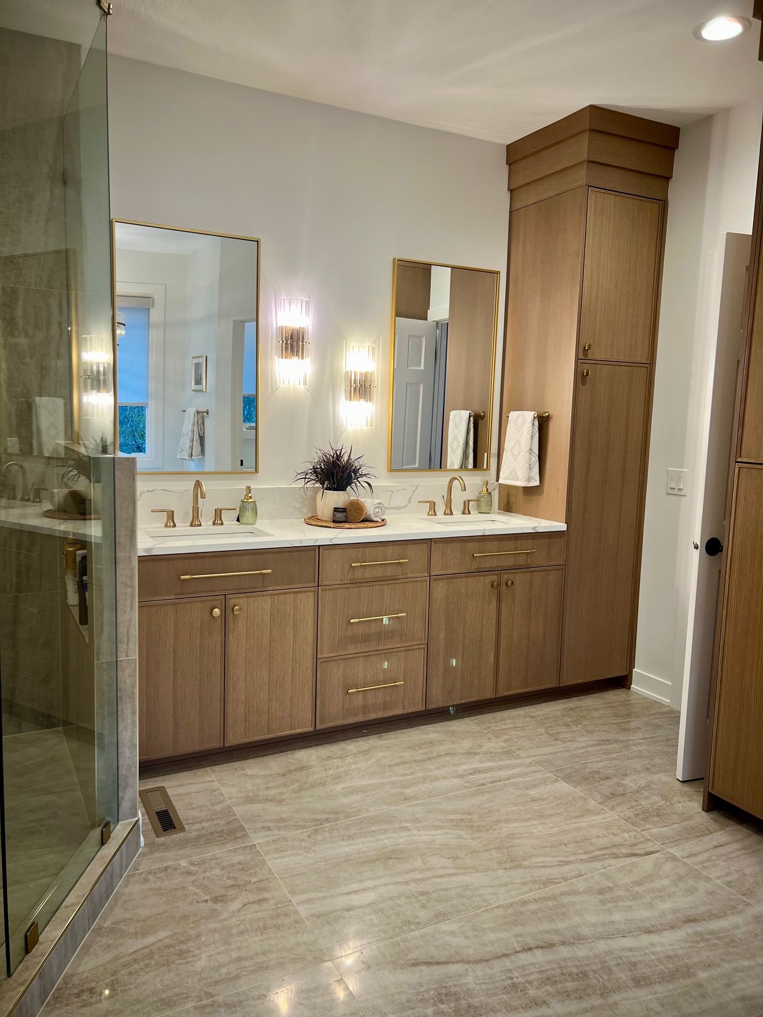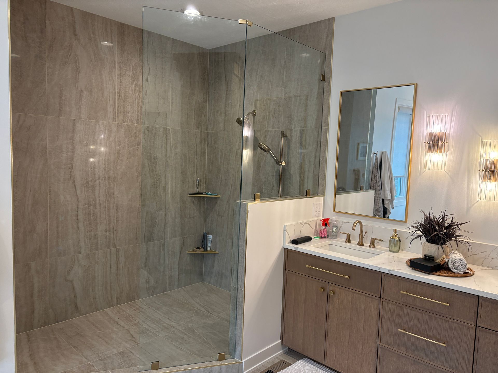 The homeowners wanted something that felt like a retreat. Warm, modern, and intentional. We worked through the design together and landed on a look that checks every box: a freestanding soaking tub with a view, walk-in shower with floor-to-ceiling tile, custom cabinetry, and lighting that actually sets a mood.